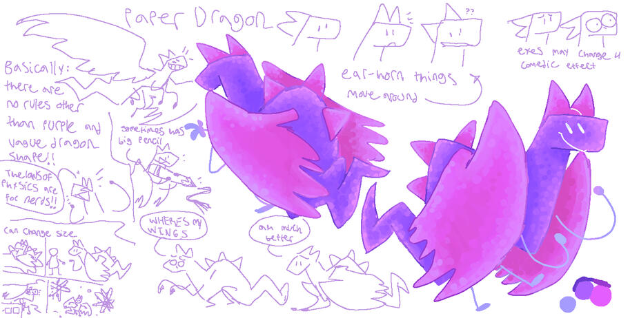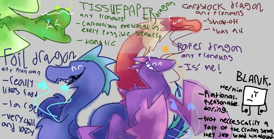 -The Crayon Squad:You may be wondering what the Crayon Squad part in Crayon Squad Lilac means.... well, technically nothing, but actually there is an answer, it's just really old and not "canon" anymore.The "Crayon Squad" is an ancient set of characters from the long-gone days of 2021, a group of four paper dragons who where chaos gods that went around creating whatever they wanted with no real positive or negative moral stance, and dragged around a fifth character that was just a regular mortal guy with them.Only one of these characters has withstood the test of time, the original Paper Dragon, as my sona. I consider them now unattached from this old lore and really only the guy representative of me. The others are just a piece of the Lilac History now I guess.I continue to call myself Crayon Squad Lilac because "Crayon Squad" was technically come up with before these guys, it just didn't really mean anything and they were an attempt at giving it meaning, but now it doesn't really mean anything again. It's confusing. Whatever.The first image below is a recent October of 2024 "ref" of Paper Dragon as my sona, up-to-date and proper, that's the charachter that's me, and the second is the super ancient february of 2021 ref for the "Crayon Squad," to look at if you're curious.(Carrd crops images weirdly and there's nothing I can do about it I'm sorry.)